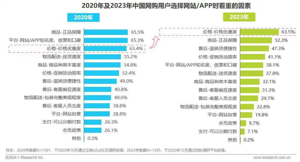 然而,2020年以來,受外部因素影響,中國消費者變得愈發(fā)謹(jǐn)慎,開始追求低價商品。艾瑞咨詢披露的《2023年中國電商市場研究報告》顯示,2023年,中國網(wǎng)購用戶選擇網(wǎng)站/APP看重的諸多因素中,“價格-價格優(yōu)惠度”排名第一。
