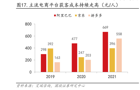 根據(jù)艾瑞咨詢以及國投證券數(shù),阿里在2019年的獲客成本為298元/人,到2021年則增長至669元/人,拼多多的獲客成本也從2019年的163元/人,增長至2021年的558元/人。