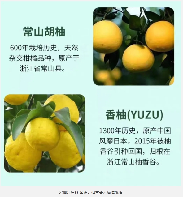 宋柚汁的鮮果原料有兩種,一是常山胡柚,二是香柚(YUZU),其中香柚占比更高。
