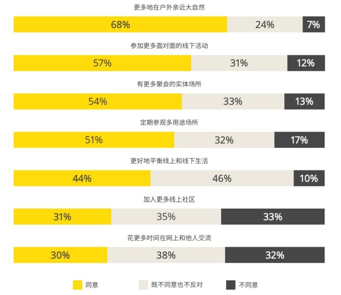 未來的社區(qū)將融合線上與線下空間。根據(jù)報告調(diào)查,有超過1/4的受訪者更喜歡線上交流,而大約3/4的受訪者更喜歡面對面交流。在這個現(xiàn)代化時代,無論是線上或線下,對人們來說都不可或缺。隨著網(wǎng)絡(luò)世界在人們生活中的比重越來越大,人際接觸和互動的減少將推動人們追求更多感官和觸覺體驗(yàn)。尤其報告指出,Z世代顯現(xiàn)出對線下社交的偏好。盡管Z世代在社交媒體的陪伴下成長,但他們更渴望與人見面,其中66%的受訪者表示這是他們首選的見面方式。雖然Z世代精通數(shù)字科技,但他們認(rèn)為,面對面的相處有助于建立信任 (65%),并帶來更有意義的相處時間 (66%)。