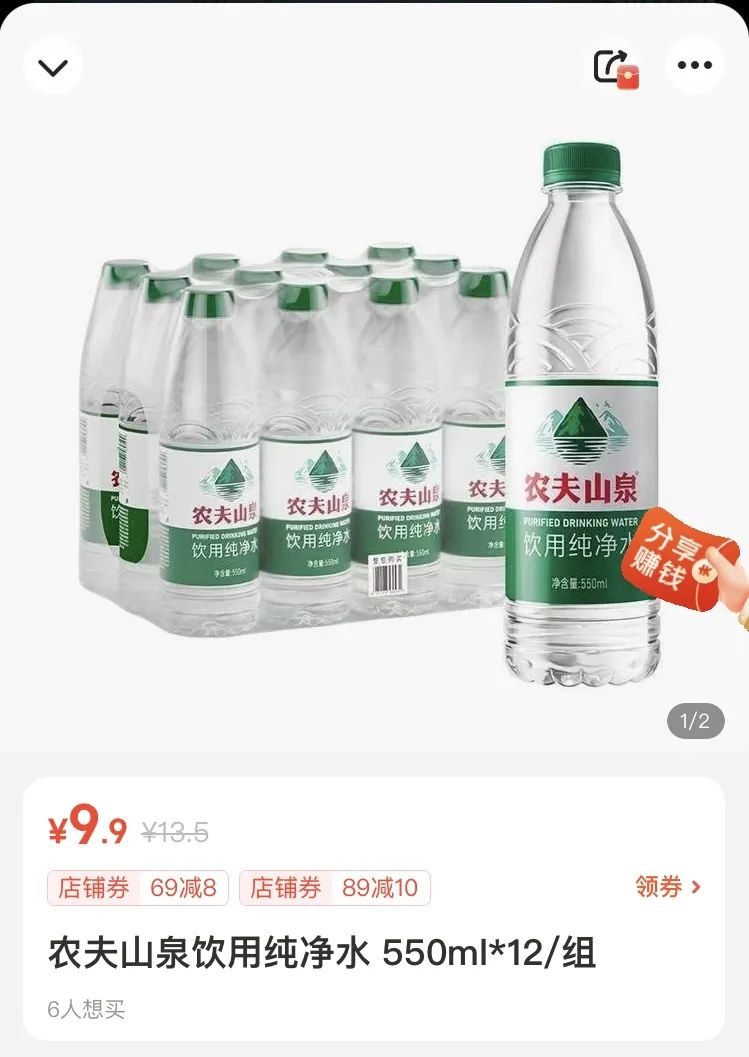 在社交平臺上,最近時常能看到這樣的評論。在網(wǎng)友曬出的超市售價圖里,每12瓶一提的農(nóng)夫山泉綠瓶水,分別出現(xiàn)過9.9元、8.8元、7.9元的售價,折合每瓶0.83、0.733、0.66元。在部分限時特價的電商平臺,甚至還出現(xiàn)了12瓶5.9元、3元、1.9元的薅羊毛價格。