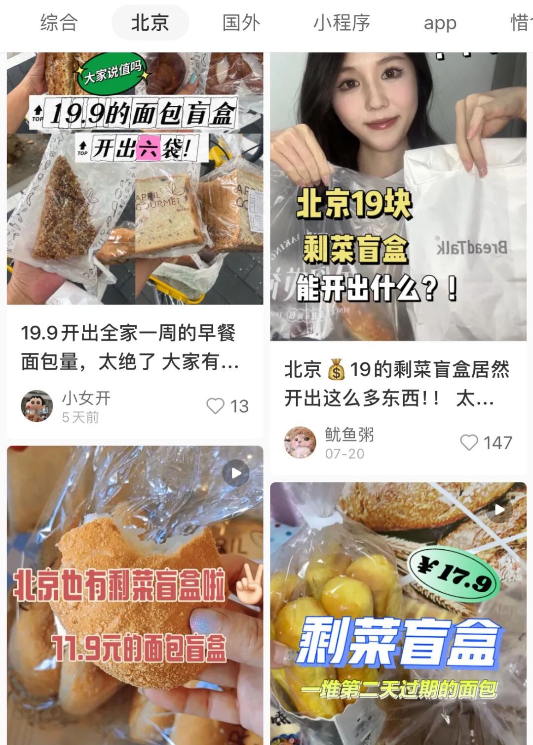 另外,年輕人對新事物充滿了熱情和分享欲,而剩菜盲盒本身就具有新奇的屬性。翻看在b站、小紅書、抖音等社交平臺關(guān)于“剩菜”盲盒的視頻和筆記已經(jīng)超過了上千條,網(wǎng)友紛紛在社交平臺上發(fā)表自己的評測,分享自己的搶盒經(jīng)驗。