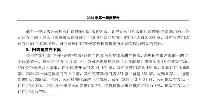 2024年一季報顯示,截至2024年3月31日,老百姓連鎖布局網(wǎng)絡(luò)(不含聯(lián)盟)覆蓋全國18個省級市場、150余個地級以上城市,在全國共開設(shè)門店14109家,其中直營門店9470家,加盟門店4639家。
