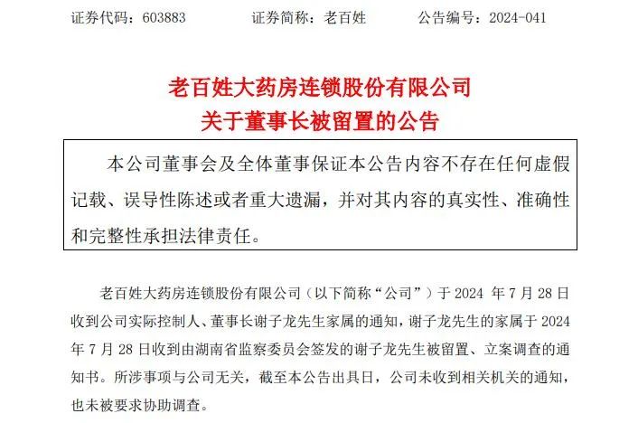 7月30日晚間,老百姓(603883.SH)公告顯示,公司實際控制人、董事長謝子龍被留置、立案調(diào)查的通知書。