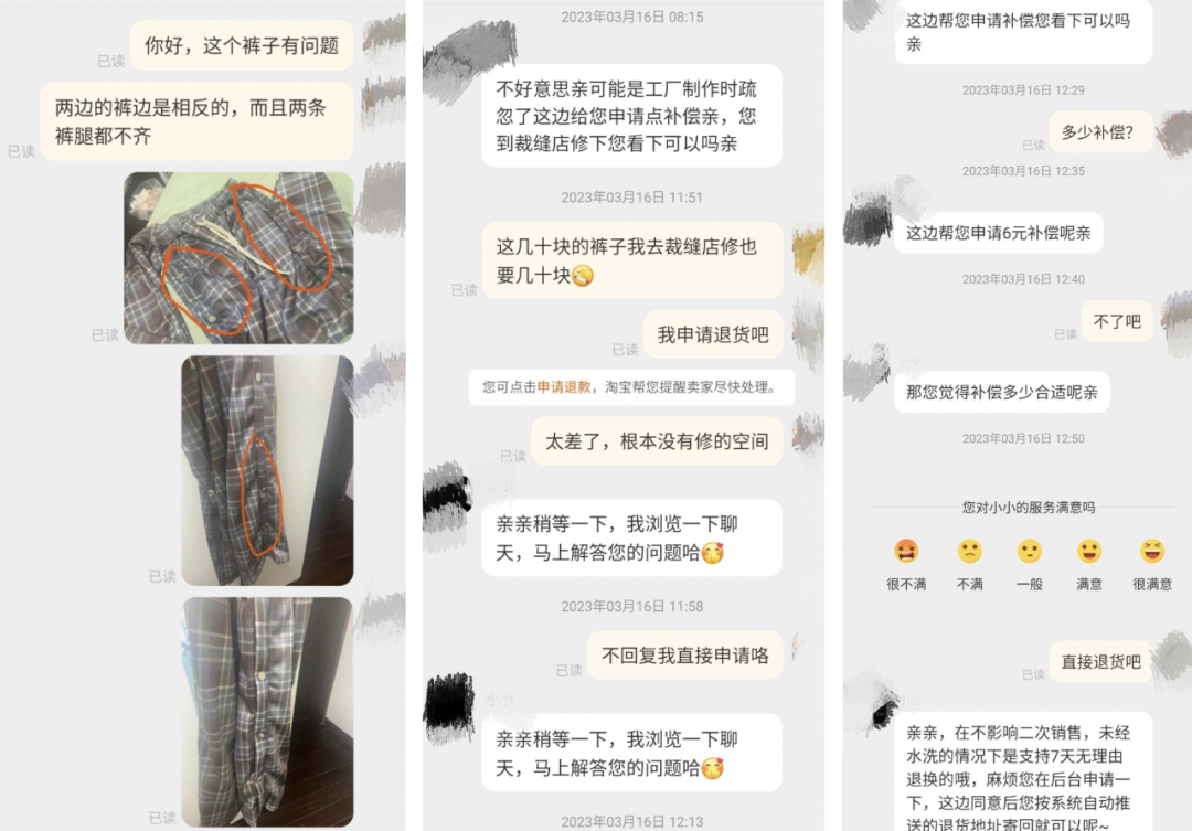 在客服表示可以補(bǔ)償6元后,林清又一次被氣笑了,直接申請(qǐng)了退貨!爱(dāng)時(shí)我就想,淘寶咋就沒有拼多多那樣的僅退款功能?我還得憋著一肚子火申請(qǐng)退貨,還要填售后卡、給褲子細(xì)心包好、留出時(shí)間等快遞員上門取件,簡(jiǎn)直浪費(fèi)我的生命!
