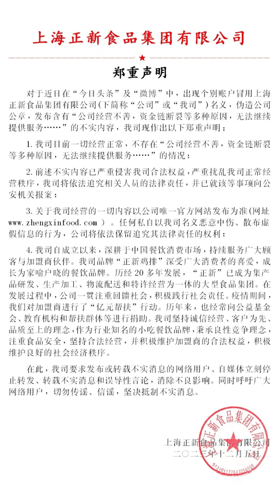 后續(xù),正新雞排還曾在其社交帳號上發(fā)文,對于今日頭條及微博中個別賬戶冒用上海正新食品集團有限公司名義,偽造公司公章,發(fā)布含有“公司經(jīng)營不善,資金鏈斷裂等多種原因,無法繼續(xù)提供服務……”的不實內(nèi)容進行鄭重聲明。天眼查顯示,正新食品系上海正新食品集團有限公司旗下品牌。