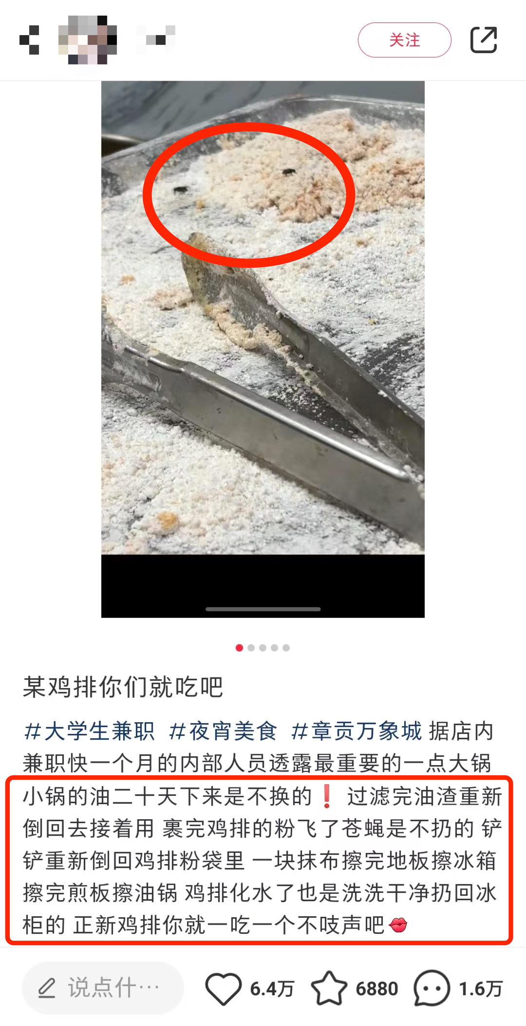 據(jù)紅星新聞報道,一名網(wǎng)友在社交媒體上公開發(fā)文稱,其在江西省贛州市章貢區(qū)的一家正新雞排店打工時,發(fā)現(xiàn)該門店存在蒼蠅污染食物、烹炸用油反復使用20多天不換油等衛(wèi)生安全隱患。