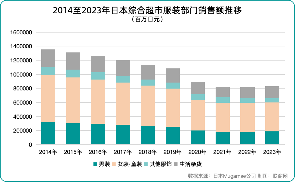 此外,從綜合超市內(nèi)各部門的銷售額變化來看,服裝部門的銷售額呈顯著下降趨勢。盡管2023年綜合超市的總體銷售額相比2014年增長了約17%,但服裝部門的銷售額卻無論是男裝還是女裝都在減少,相比2014年減少了約38%。