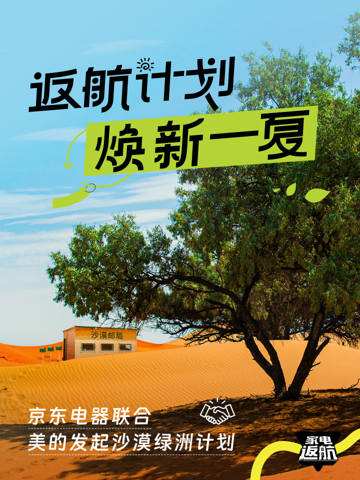 “森林治愈沙漠,信件治愈人心,綠色消費(fèi)治愈地球”,2024年的炎夏,京東電器聯(lián)合中國(guó)郵政沙漠郵局啟動(dòng)舊家電返航計(jì)劃,號(hào)召更多年輕人加入綠色消費(fèi),守護(hù)環(huán)境。沙漠郵局在騰格里沙漠腹地駐扎,荒漠之中,一封封信件的收寄讓全國(guó)人民感受到來(lái)自遠(yuǎn)方的溫暖祝福。京東電器聯(lián)合美的一起加入到沙漠郵局的沙漠綠洲計(jì)劃中,消費(fèi)者參與以舊換新活動(dòng),線(xiàn)上分享環(huán)保故事,便有機(jī)會(huì)在沙漠認(rèn)養(yǎng)一顆沙棗樹(shù),種下綠色,延續(xù)綠洲活力。