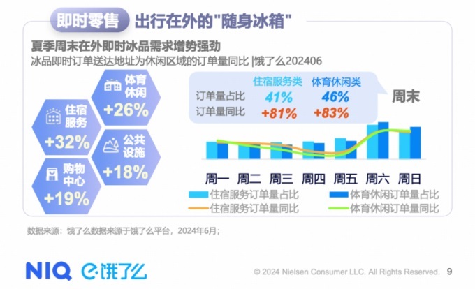 辦公和酒店等細(xì)分場景的吃冰需求也正高增。報(bào)告顯示,今年6月,送往寫字樓冰品訂單量同比增長30%,其中深夜加班場景的冰品訂單更是同比增長40%。同時(shí),夏季酒店、體育場館等出行場景的即時(shí)冰品需求增勢強(qiáng)勁,周末的冰品訂單占比更是超過四成,訂單量同比增長均超過80%。