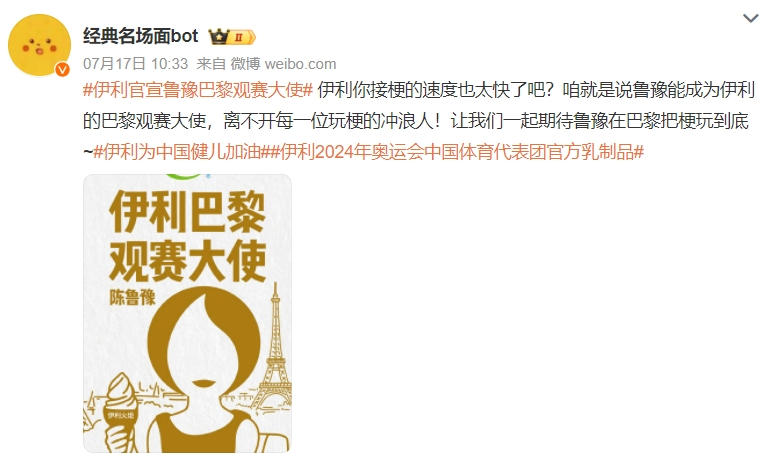 而且,伊利在線上主打社媒互動(dòng)和“聽(tīng)勸營(yíng)銷”。網(wǎng)友們覺(jué)得運(yùn)動(dòng)員們的國(guó)風(fēng)宣傳照不錯(cuò),要求“讓這個(gè)硬照上包裝”,伊利立刻成立巴黎定制款專項(xiàng)小組,連夜畫好功夫裝產(chǎn)品的新包裝設(shè)計(jì)稿。這屆巴黎奧運(yùn)會(huì)logo被中國(guó)網(wǎng)友戲稱“撞臉魯豫”,伊利就順勢(shì)邀請(qǐng)魯豫擔(dān)任旗下品牌優(yōu)酸乳“巴黎形特別像大使”,借梗形成二次傳播。