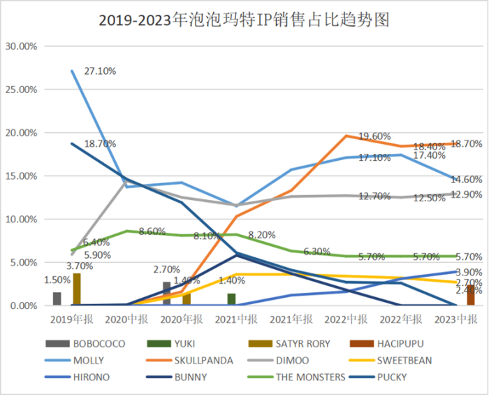數(shù)據(jù)顯示,近年來,MOLLY和PUCKY的影響力正在逐漸下降。深層次的原因是,沒有內(nèi)容支撐的形象IP只能達成“短期”的業(yè)績使命,難以展露更長期的商業(yè)價值。
