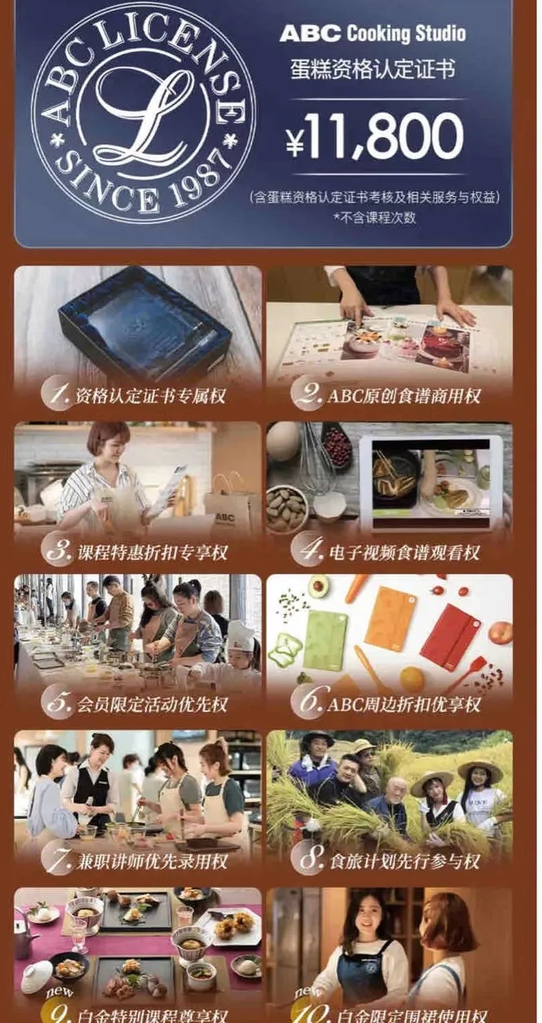 另外一種是白金會員會籍,即花錢培訓單種烘焙證書考核資格,通過考試獲得。而ABC蛋糕資格認定證書的白金會員會籍在1.18萬元。