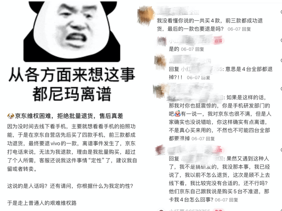 阿星此舉并非個例,社交平臺上來自“阿星們”的惡意指控不在少數(shù)。有網(wǎng)友表示在京東批量購買了12個商品,無法享受無理由退貨;在京東購買了四臺手機前三臺成功退貨,最后一臺手機退貨被拒絕……