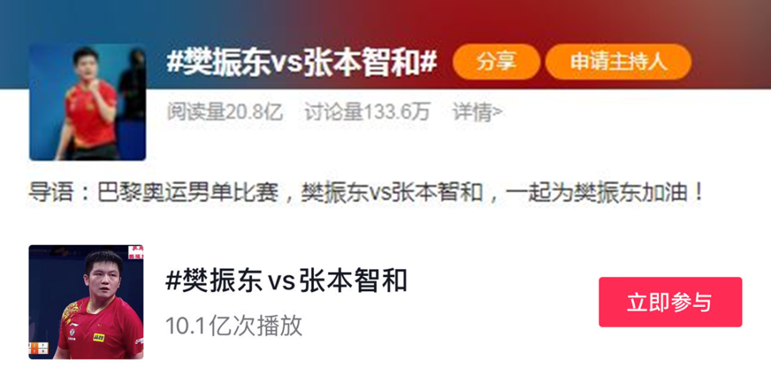 「新消費(fèi)101」查看微博發(fā)現(xiàn),“樊振東vs張本智和”話題的閱讀量超20億,討論量達(dá)133.6萬(wàn),而在抖音,“樊振東vs張本智和”話題也有約10億次播放。在微博上,“潘展樂(lè)100自由泳金牌”話題閱讀量為9.8億,對(duì)比之下,樊振東那場(chǎng)“大逆轉(zhuǎn)”流量之猛不言而喻。