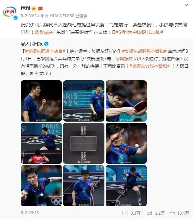 相比之下,同樣作為樊振東的品牌方,伊利第一時(shí)間用主號(hào)配文字轉(zhuǎn)發(fā)人民日?qǐng)?bào)的相關(guān)內(nèi)容,獲得3.7萬(wàn)點(diǎn)贊。