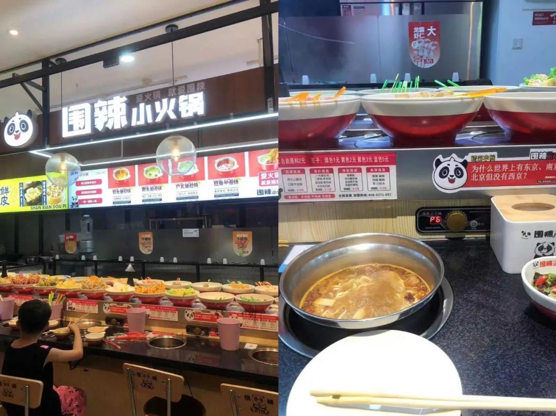 為了讓小火鍋看起來(lái)便宜,自助模式興起,三四十元一位,隨便暢吃,代表品牌有農(nóng)小鍋、龍哥自助小火鍋;也有傳統(tǒng)的回轉(zhuǎn)小火鍋模式,豐儉由人,由顧客自己挑選不同價(jià)位的菜品,客單價(jià)控制在20-40元,代表品牌比如串士多、圍辣等。