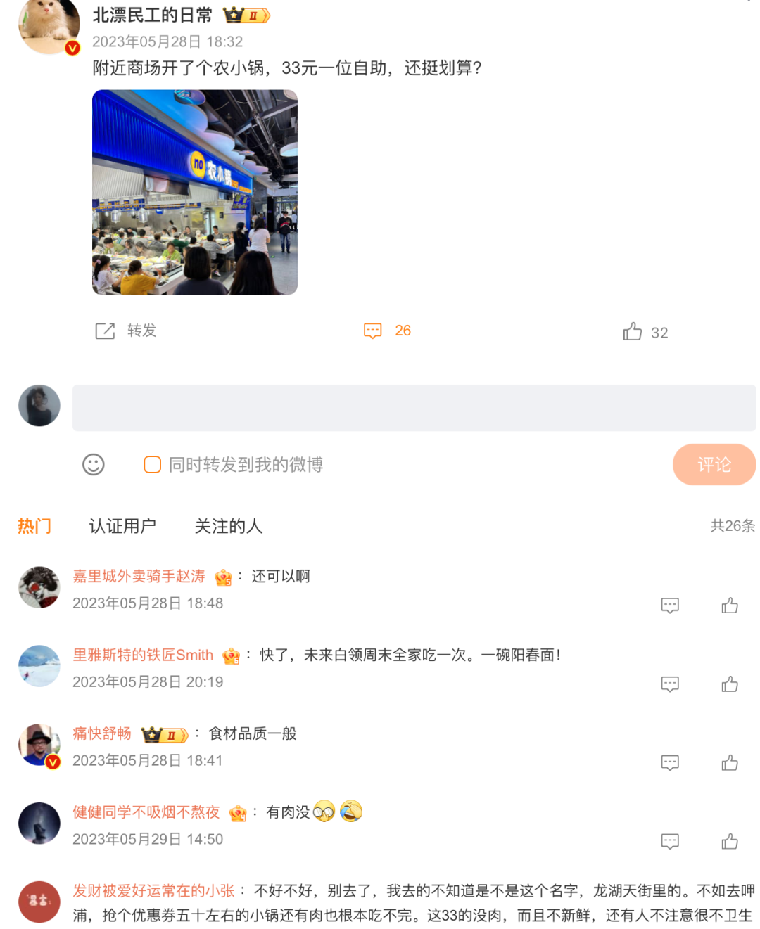 新一和朋友去體驗(yàn)了一把農(nóng)小鍋后告訴餐觀局:“食材品質(zhì)不好,沒(méi)什么可吃的。”