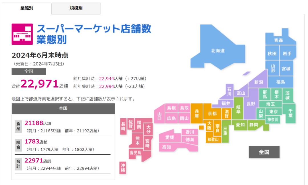 根據(jù)日本三大超市行業(yè)協(xié)會(huì)的聯(lián)合統(tǒng)計(jì),截至2024年6月末,日本超市門店數(shù)量共22,971家,其中綜合超市1,783家,食品超市22,971家,后者約為前者的13倍。并且,綜合超市的食品賣場(chǎng)也基本采用食品超市的經(jīng)營(yíng)手法?梢哉f(shuō),食品超市已成為日本超市的主流業(yè)態(tài),是支撐日本消費(fèi)者日常飲食生活的重要商業(yè)基礎(chǔ)設(shè)施。