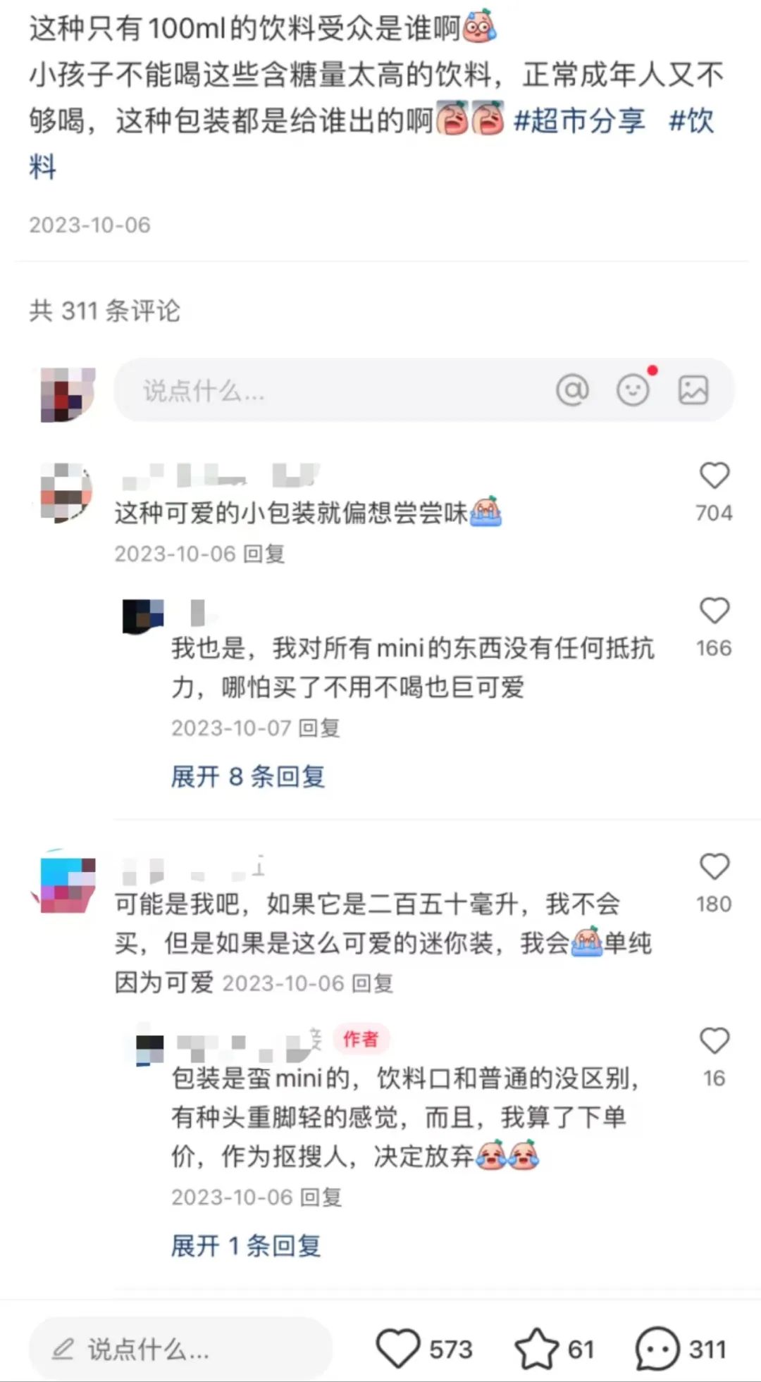 還有網(wǎng)友靈魂發(fā)問——100ml的飲料受眾到底是誰?不少人評論:“這種可愛的小包裝就偏想嘗嘗味”“哪怕買了不用不喝也超可愛”……