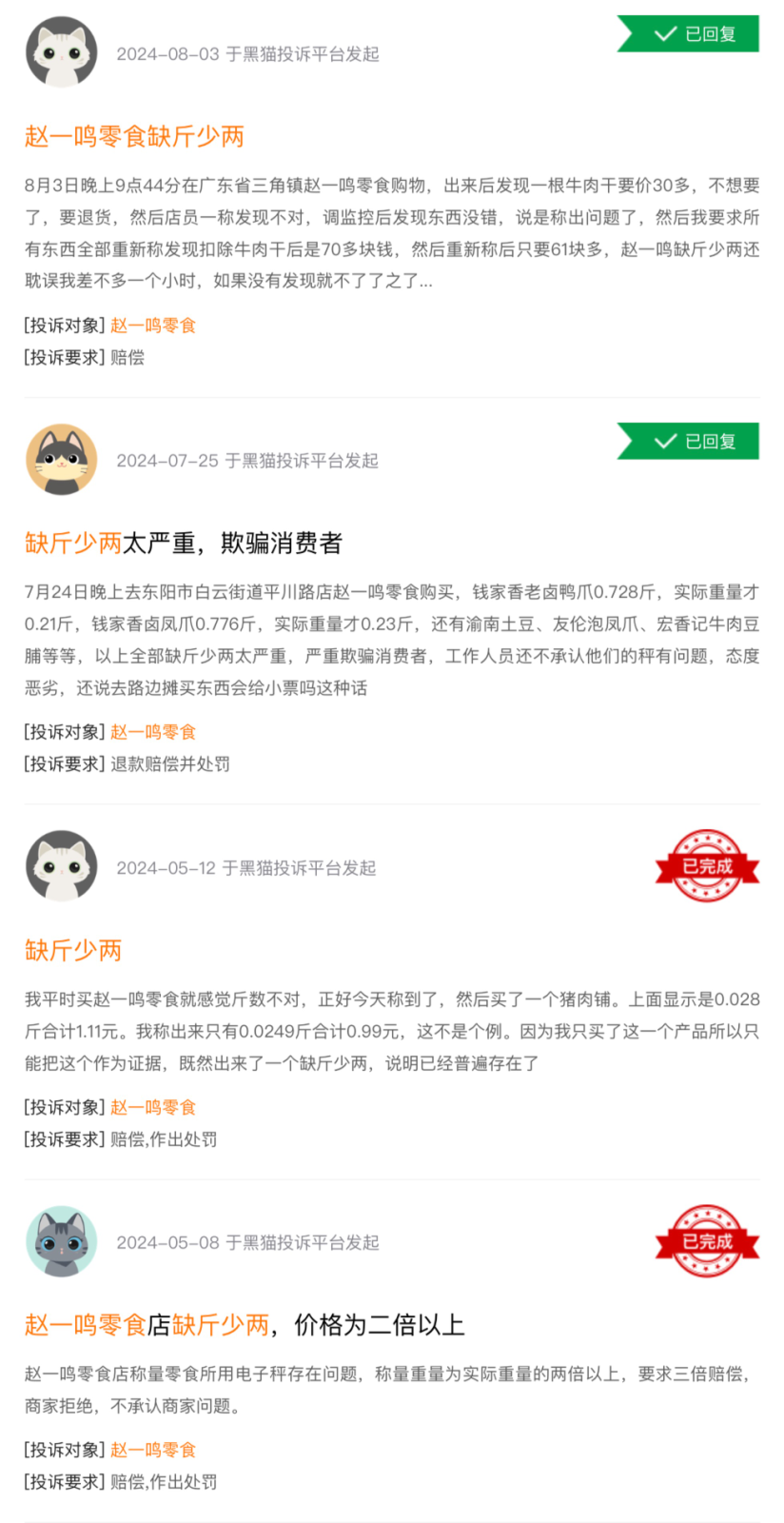 雷達(dá)財經(jīng)注意到,在李先生發(fā)布的網(wǎng)帖下方以及黑貓投訴平臺上,有多位消費者稱自己在趙一鳴零食店購物時也曾遇到過類似的情況。
