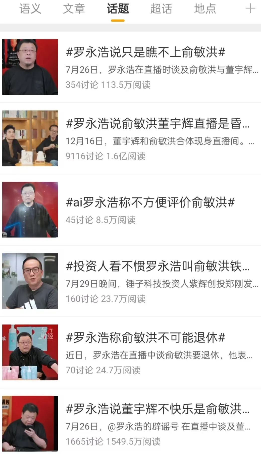 光是在微博上搜索,就能發(fā)現(xiàn)許多相關(guān)的熱搜話(huà)題。如“羅永浩說(shuō)只是瞧不上俞敏洪”“羅永浩稱(chēng)俞敏洪董宇輝合體直播又是昏招”“羅永浩稱(chēng)俞敏洪不可能退休”等等。