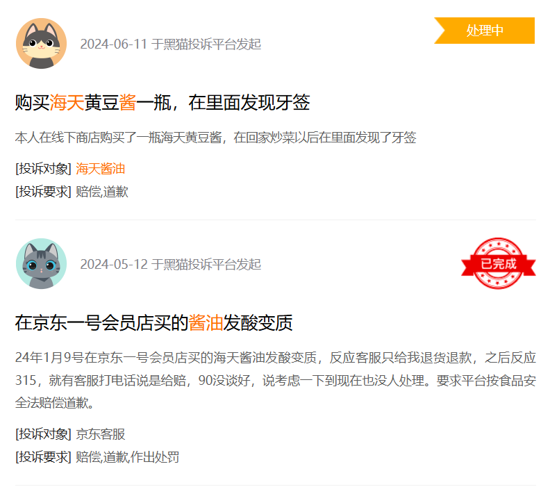 主業(yè)深陷泥潭,與此同時(shí)接連發(fā)生的食安問(wèn)題,同樣給了“醬油一哥”當(dāng)頭一棒。2021年有消費(fèi)者曝光在超市買的海天醬油瓶?jī)?nèi)生蟲,2022年的海克斯醬油事件更是給海天貼上了“科技與狠活”的標(biāo)簽。時(shí)至今日,在黑貓投訴平臺(tái)搜索海天醬油仍然能夠看到產(chǎn)品變質(zhì)、有異物等投訴。