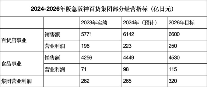 今年5月15日,阪急阪神百貨集團(tuán)發(fā)布2024-2026年度中期經(jīng)營(yíng)計(jì)劃。在全面超計(jì)劃完成上期計(jì)劃后,到2026年度,百貨店事業(yè)銷售額計(jì)劃達(dá)到6920億日元,比2023年增加970億日元,其中的主力阪急本店銷售額要達(dá)到4000億日元,比2023年度增加860億日元,國(guó)內(nèi)百貨店銷售額要達(dá)到 5500億日元,比2023年增加360億日元,海外百貨店銷售額要達(dá)到1420億日元,比2023年增加620億日元。