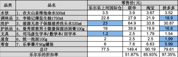 數(shù)據(jù)來源:樂爾樂、聯(lián)華超市線下調(diào)研;淘寶、拼多多價(jià)格查詢