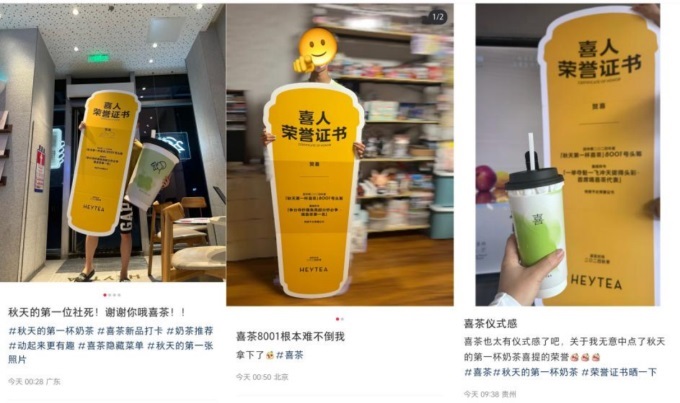 喜茶還在門(mén)店推出了給到店第一單8001號(hào)頒發(fā)“超大大大喜人榮譽(yù)證書(shū)”活動(dòng)。吸引了許多消費(fèi)者連夜去喜茶24小時(shí)門(mén)店在零點(diǎn)下單領(lǐng)證書(shū)。通過(guò)這種趣味的互動(dòng),給消費(fèi)者喝秋天的第一杯喜茶時(shí)增添了更濃厚的氛圍感和儀式感。