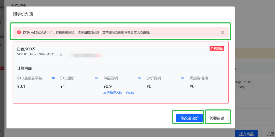 以大促報名為例,當商家在設(shè)定報名價格時,若該價格觸及了預(yù)設(shè)的風險價格區(qū)間,系統(tǒng)將即時觸發(fā)價格風險預(yù)警,并展示出SKU的最低實際到手價。