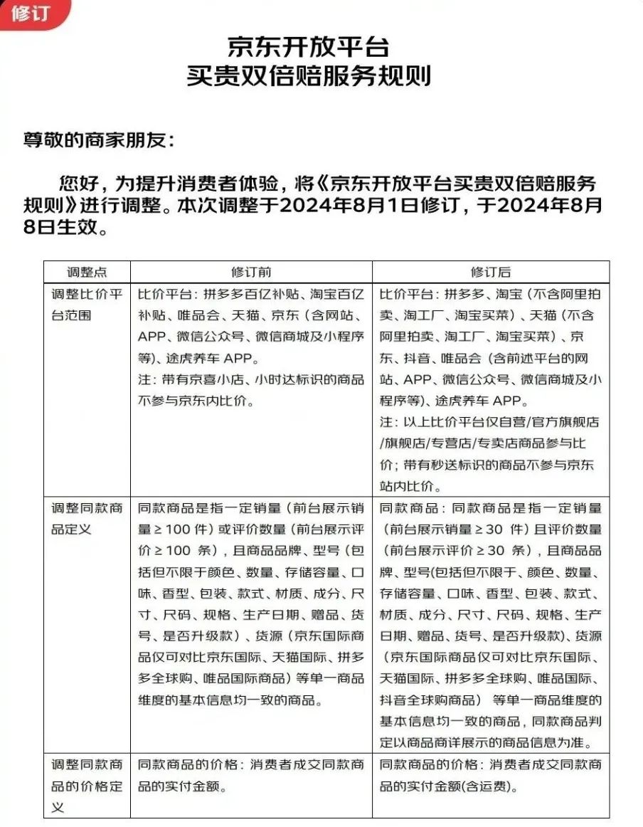 而在今日,京東修訂后的《京東開放平臺買貴雙倍賠服務(wù)規(guī)則》正式生效,服務(wù)的比價范圍進一步擴大。