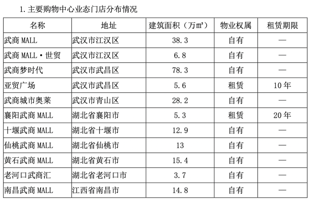 武商集團(tuán)2023年財(cái)報(bào)顯示:武商集團(tuán)擁有武商MALL、武商MALL•世貿(mào)、武商夢(mèng)時(shí)代、南昌武商MALL等主要購(gòu)物中心11家,分別坐落于湖北武漢、襄陽(yáng)、仙桃、黃石、十堰、老河口及江西南昌等核心商圈,購(gòu)物中心總建筑面積約為227.4萬(wàn)m²,自有物業(yè)建筑面積約211.9萬(wàn)m²。