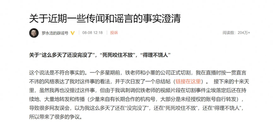 8月8日,羅永浩“更狠”,直接在網(wǎng)上發(fā)表了一篇長(zhǎng)達(dá)五千字的文章《關(guān)于近期一些傳聞和謠言的事實(shí)澄清》,對(duì)近期圍繞他的一些不實(shí)言論進(jìn)行了反駁和澄清。