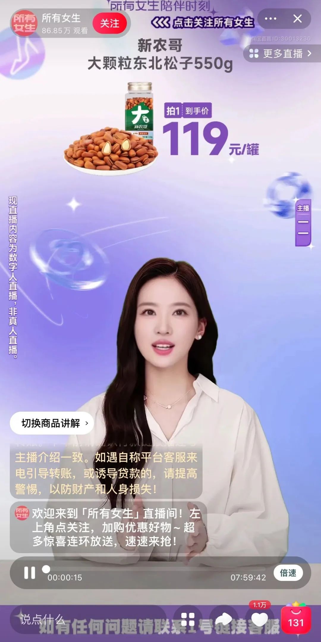 在主播層面,美腕成立了由12人組成的助播團,今年618期間,還引入了AI數(shù)字人技術到“所有女生”直播間中。
