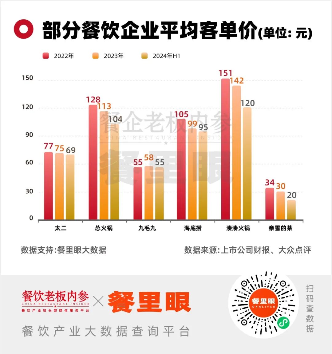 大部分企業(yè)跟著大潮降價(jià)。如太二酸菜魚的顧客人均消費(fèi)已從2023年的75元下降至69元,一朝回到7年前。慫火鍋客單價(jià)也從去年的113元,降至104元。
