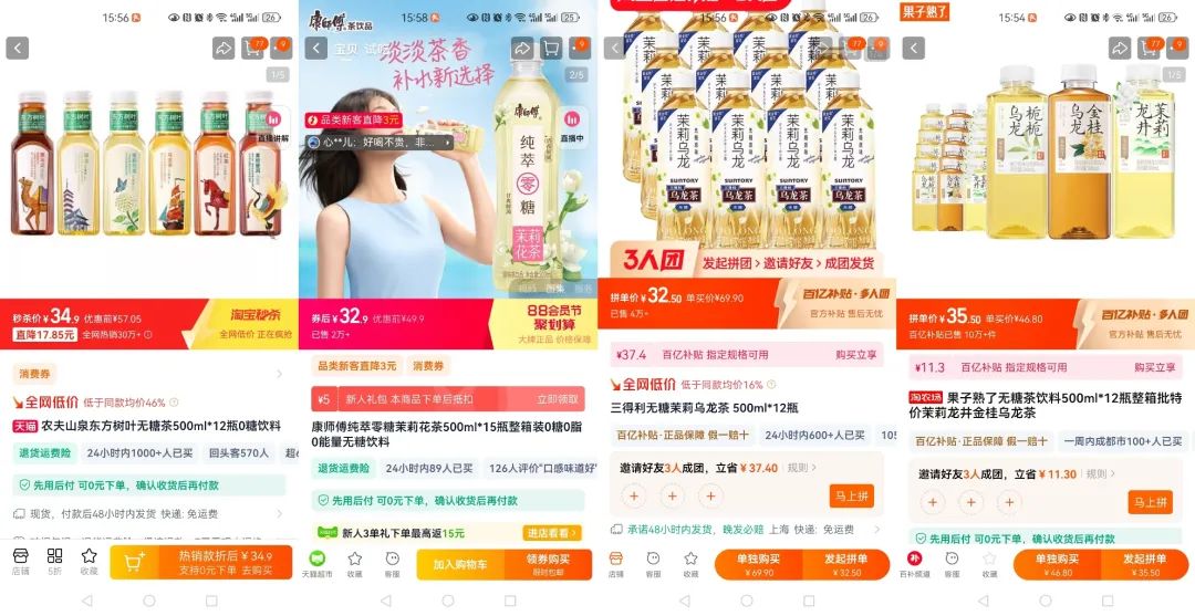 而在線上平臺(tái),無(wú)糖茶的價(jià)格戰(zhàn)更是愈演愈烈,市面上主流的無(wú)糖茶產(chǎn)品價(jià)格在補(bǔ)貼后均跌破3元大關(guān)。例如,在淘寶上,果子熟了無(wú)糖茶500ml*12瓶的套裝在百億補(bǔ)貼后拼團(tuán)價(jià)僅為35.5元,1瓶不到3元;同規(guī)格的三得利無(wú)糖烏龍茶更是降至了每瓶2.7元的低價(jià);康師傅純萃零糖茉莉花茶單品售價(jià)更是不到2.2元;就連向來(lái)穩(wěn)定的農(nóng)夫山泉東方樹(shù)葉價(jià)格也僅需2.9元一瓶。