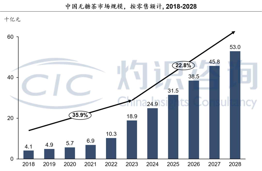 根據(jù)CIC灼識(shí)咨詢統(tǒng)計(jì),2023年中國(guó)無(wú)糖茶市場(chǎng)的規(guī)模已達(dá)到189億元,預(yù)計(jì)到2028年將達(dá)到530億,布局無(wú)糖茶賽道的品牌更是超過(guò)50個(gè)。此外,“中式養(yǎng)生”也確實(shí)是目前消費(fèi)的主流趨勢(shì)。根據(jù)新華社客戶端聯(lián)合小紅書共同發(fā)布了《Z世代健康說(shuō):新中式新生活》,2023年小紅書上關(guān)于“養(yǎng)生”的話題瀏覽量達(dá)到了25.1億,新增筆記數(shù)量高達(dá)532.2萬(wàn)條。