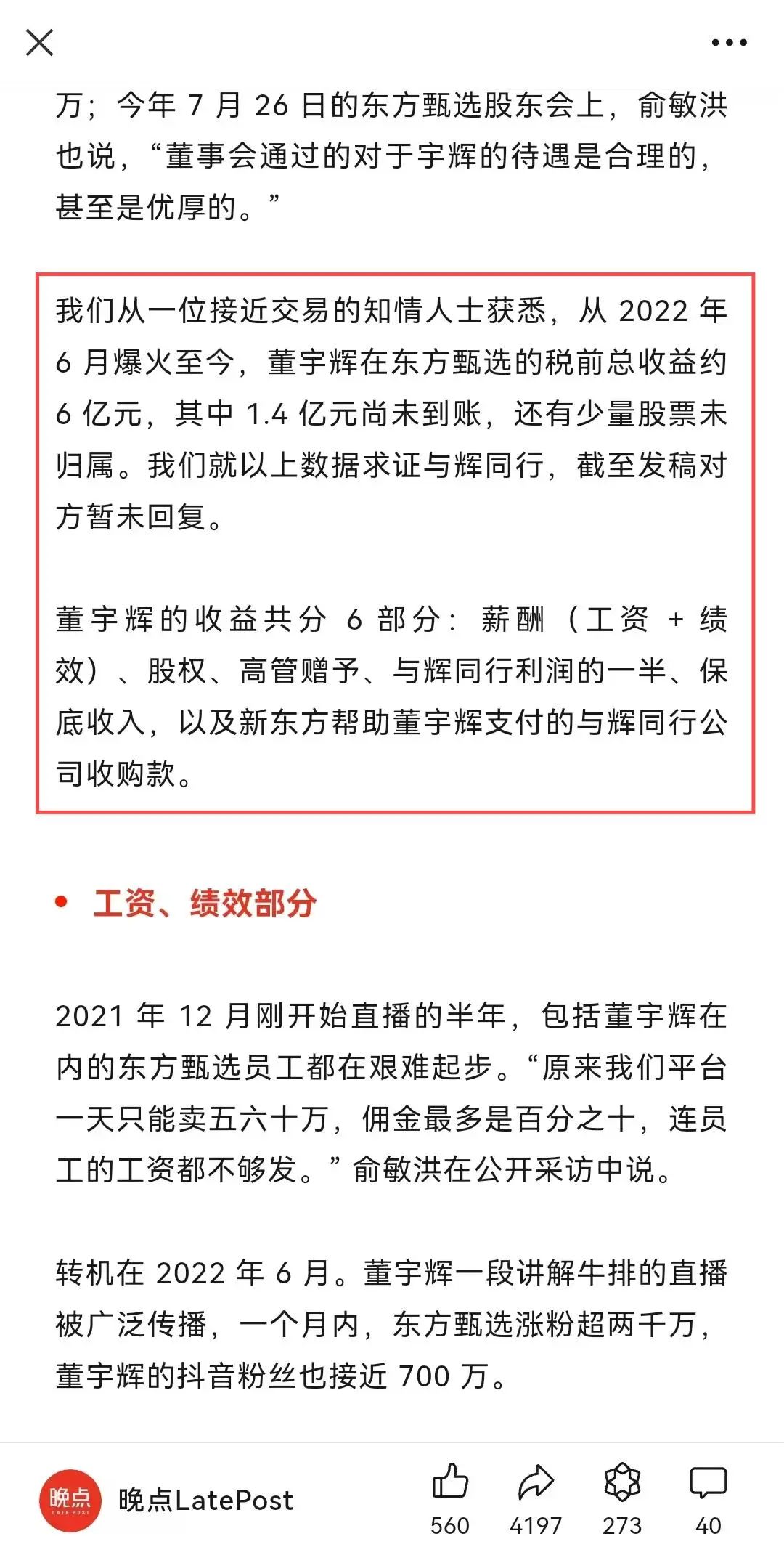 近日,據(jù)晚點LatePost 報道,董宇輝的收益共分 6 部分:薪酬(工資 + 績效)、股權(quán)、高管贈予、與輝同行利潤的一半、保底收入,以及新東方幫助董宇輝支付的與輝同行公司收購款。