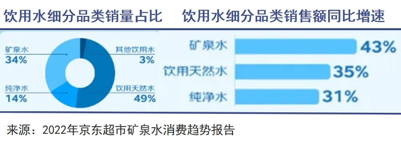 根據(jù)京東超市發(fā)布的《2022礦泉水消費(fèi)趨勢(shì)年度報(bào)告》,目前礦泉水銷(xiāo)售額增速最快,純凈水最低,消費(fèi)者更青睞的品類(lèi)是礦泉水。純凈水的消費(fèi)占比已經(jīng)被壓縮到14%,行業(yè)從純凈水到天然水再到礦泉水的升級(jí)路徑十分清晰。