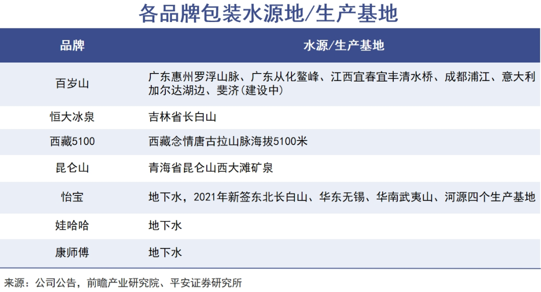 當(dāng)前瓶裝水價(jià)格帶整體上移后,怡寶的盈利困局主要在于生產(chǎn)模式。在《鐘睒睒,首富的“礦產(chǎn)”生意》一文中我們指出,農(nóng)夫山泉天然礦泉水的本質(zhì)是“礦產(chǎn)生意”,自己“找礦”,自建生產(chǎn)基地,樹(shù)立起政策壁壘、渠道壁壘和品牌壁壘,目前農(nóng)夫山泉擁有12大水源地和30余座工廠。