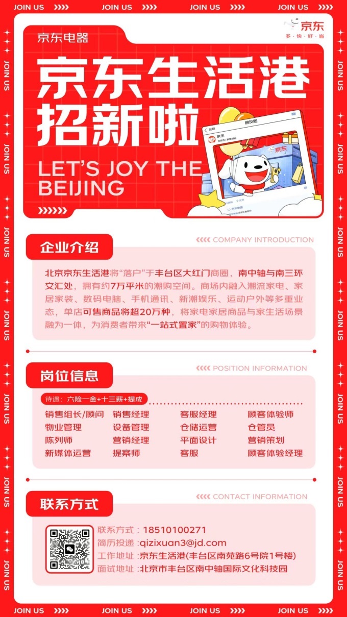 京東在北京豐臺(tái)大紅門商圈的購物廣場京東生活港、以及在朝陽雙井的項(xiàng)目傳來最新消息。兩家門店開啟大規(guī)模員工招聘,計(jì)劃共招聘500人,涵蓋銷售經(jīng)理、物業(yè)管理、倉儲(chǔ)運(yùn)營、家電家居提案師、顧客體驗(yàn)師等20余種崗位,除了13薪和提成獎(jiǎng)勵(lì)外,還提供六險(xiǎn)一金等較為完善的福利保障。