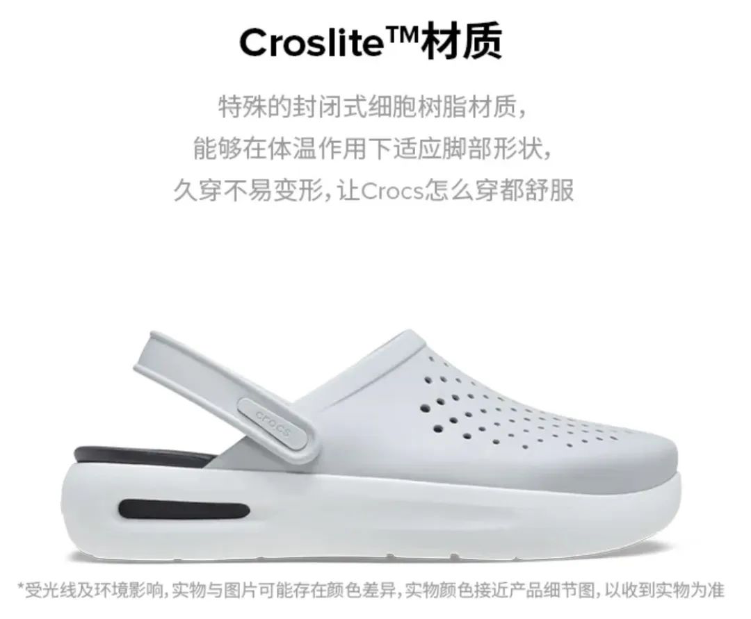 CROCS洞洞鞋采用的材料叫Croslite,并非塑料與橡膠,是一種閉孔樹(shù)脂,既輕便又防水防滑、抗菌防臭,還能夠在體溫作用下適應(yīng)腳部形狀,使鞋子與腳緊密貼合,穿著更舒適。