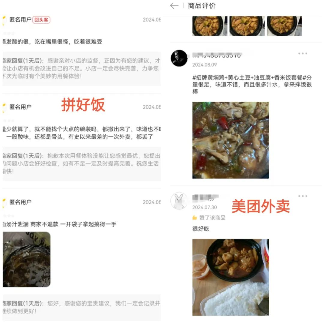 不少消費(fèi)者也能在拼好飯中點(diǎn)到和美團(tuán)外賣中不相上下的餐,但是,大多還是在踩雷。也有很多人會(huì)被拼好飯的價(jià)格嚇到,因?yàn)樘阋朔炊桓尹c(diǎn),因?yàn)闀?huì)懷疑這真的能給人吃嗎。