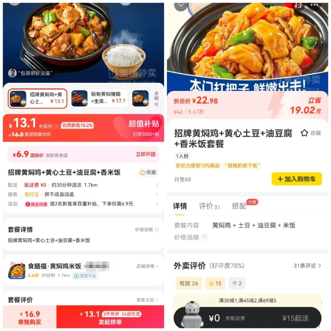 就算不是新用戶,在美團(tuán)拼好飯中點(diǎn)外賣也會(huì)比在美團(tuán)外賣中點(diǎn)餐便宜。在同一家店,一份招牌黃燜雞+黃心土豆+油豆腐+香米飯的套餐。
