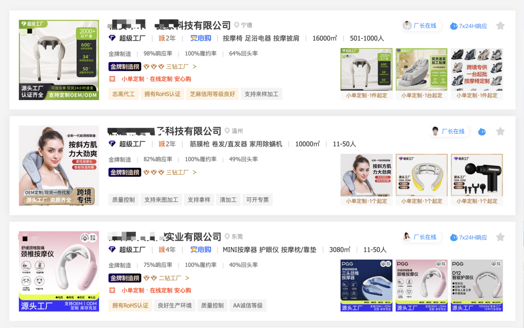 據(jù)驚蟄研究所分析,之所以會(huì)出現(xiàn)這種驚人的相似,可能是因?yàn)槠放苽冞x擇了相同的貼牌代工廠。實(shí)際上,只要在1688上搜索“頸椎按摩儀”,就可以找到不少熱銷款頸椎按摩儀的源頭工廠,進(jìn)行貼牌生產(chǎn)。