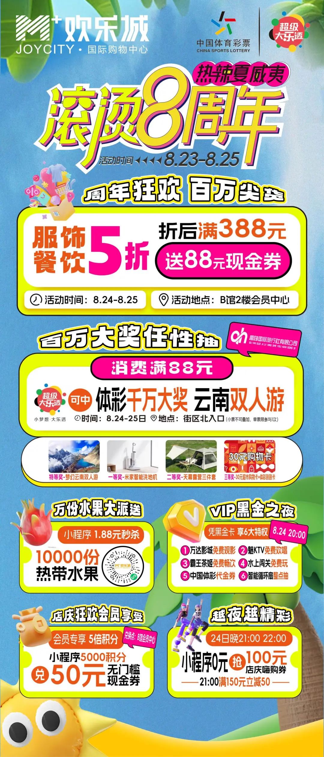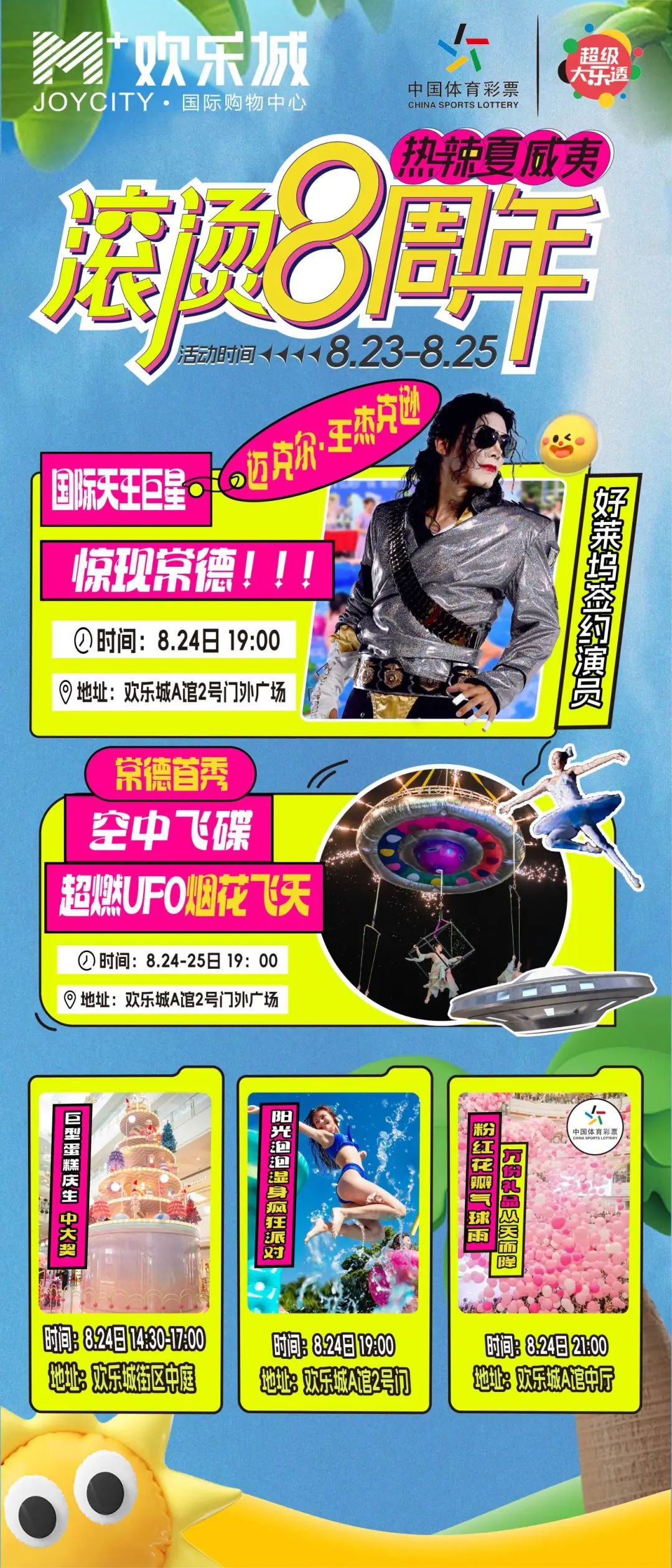 8月24日當(dāng)天,歡樂(lè)城街區(qū)中庭將驚現(xiàn)一個(gè)巨型夏威夷水果蛋糕,無(wú)論您是與家人一同前來(lái),還是與朋友結(jié)伴而行,都能品嘗到這份特別的甜蜜。這不僅僅是一塊蛋糕,更是商場(chǎng)對(duì)每一位顧客的感恩與祝福,蛋糕中還暗藏驚喜等您發(fā)現(xiàn)。我們還準(zhǔn)備有夏威夷陽(yáng)光泡泡濕身趴、中國(guó)體彩贊助的夏威夷粉紅花瓣氣球雨等50+人氣活動(dòng),期待一同感受周年慶的歡樂(lè)氛圍,開(kāi)啟一段甜蜜的購(gòu)物之旅。