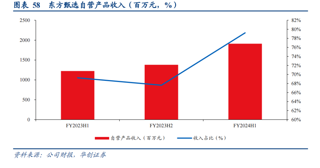據華創(chuàng)證券公開的新東方深度研究報告數(shù)據顯示:東方甄選FY24H1自有品牌商品及直播電商營收為 24.1億元(同比增長36.6%),是業(yè)務大頭(占比 86%),其中自營品營收為19億元(同比增長超 50%),占比提升至78.8%(去年同期約占 69%)。