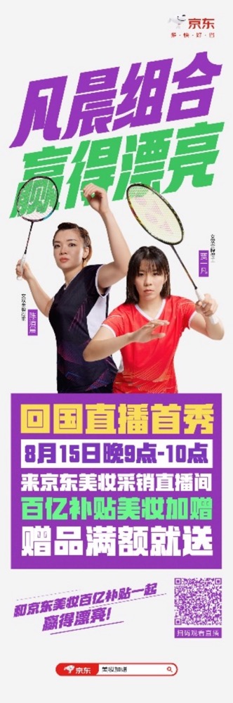 8月15日晚上9點,京東特別邀請到了2024年巴黎奧運會羽毛球女子雙打冠軍“凡晨組合”陳清晨、賈一凡,來到京東美妝采銷直播間,除了將分享兩人在奧運賽場上的奪金心路歷程,回應(yīng)近期圍繞他們的熱點話題,還將為大家分享自己參加比賽時化妝的技巧,解答粉絲們的十萬個為什么。