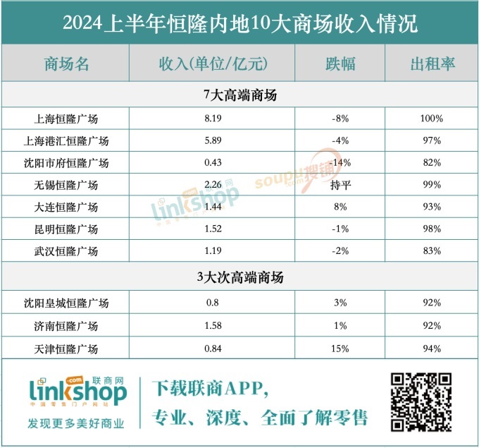 其中,內(nèi)地整體租賃收入下滑4%、租戶(hù)銷(xiāo)售額下滑13%。內(nèi)地零售物業(yè)方面,2024上半年恒隆的商場(chǎng)組合收入下跌3%。